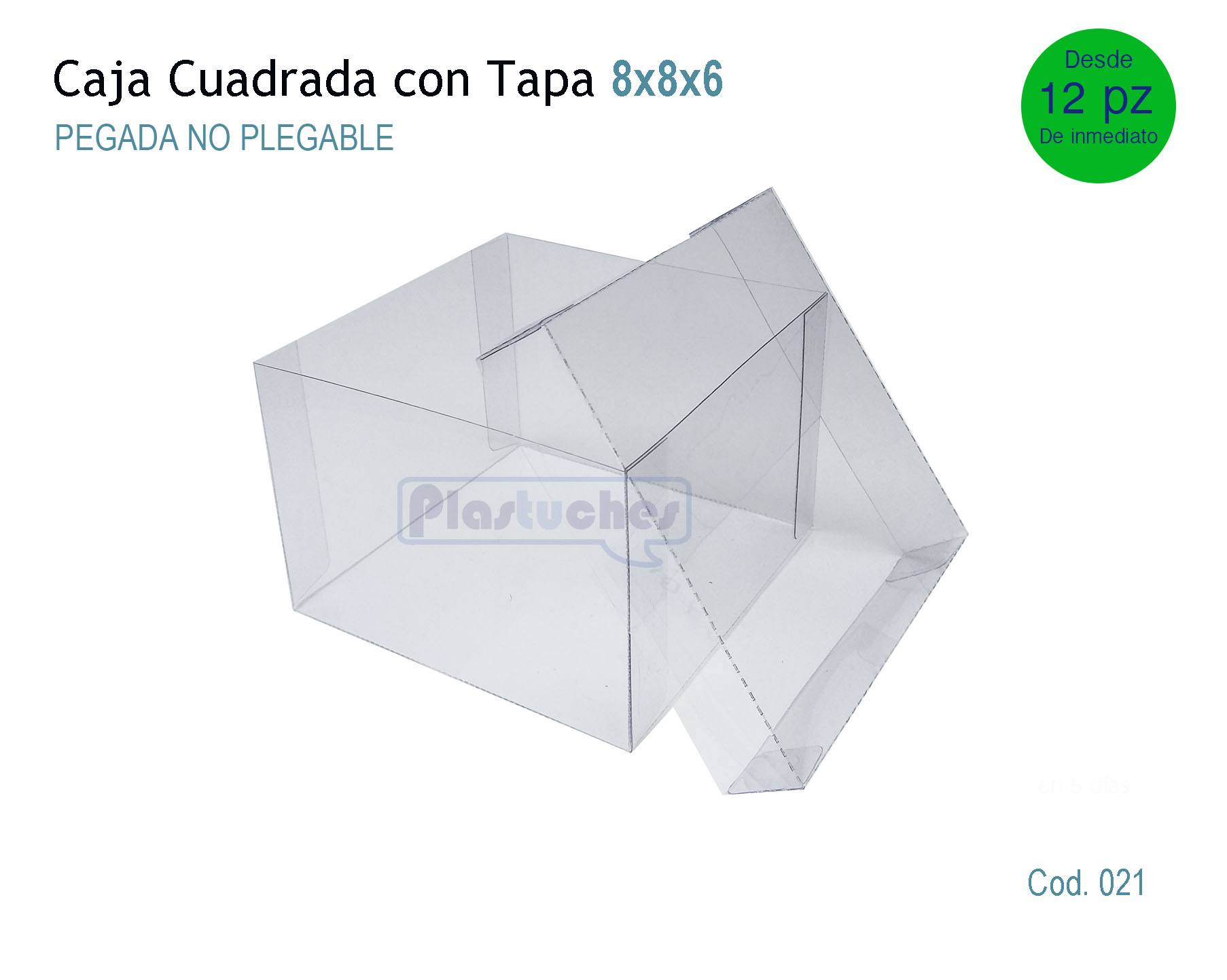 Caja Cuadrada con Tapa de PVC transparente semirígido Calibre 10. Frente: 8cm, profundidad: 8cm, Altura: 6cm. Lista para usarse. Se entrega pegada. No incluye insertos o decorativos ni impresión alguna. Disponibilidad: Inmediata.